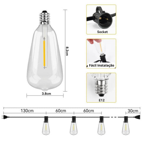 Proporcione um toque de encanto aos seus espaços externos com o Varal de Luzes com Lâmpadas Bivolt Impermeável para Decoração.